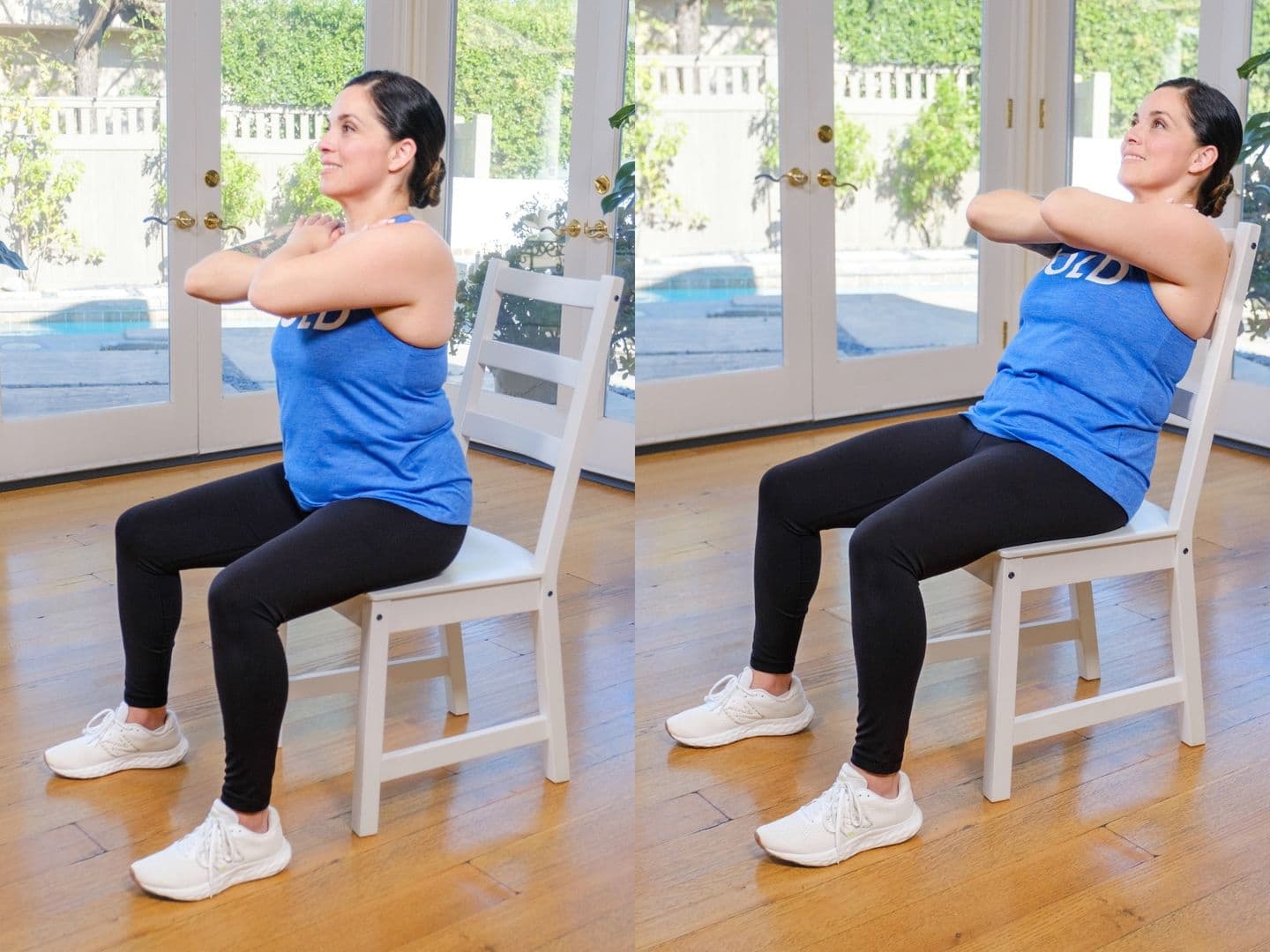 Go to the starting position for a chair sit-up, but keep your arms by your side. Reach both arms in the air. One at a time, bring one of your elbows to the opposite side as you lift the knee. Alternate sides. While doing this, be sure to keep your core muscles engaged and breathe as you move.